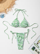 Green Striped Halter Tie Bikini with Thong String Tie Bottoms