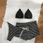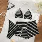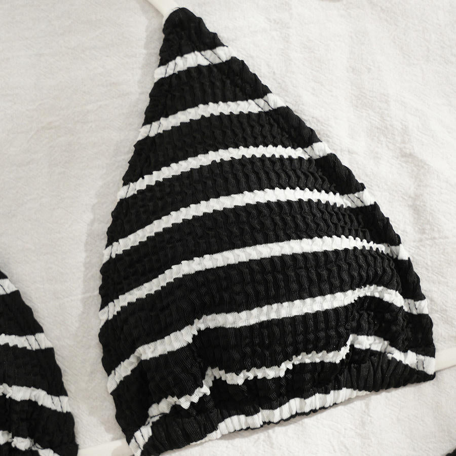 Make a statement with this sophisticated three-piece bikini, designed for those who appreciate refined swimwear details. The textured stripe pattern adds visual interest while the padded halter-neck provides essential support and a flattering silhouette. Adjustable lace-up closures offer customizable fit and a touch of elegance. The three-piece design delivers versatility—mix and match pieces or wear as a complete set. Perfect for beach days or poolside lounging, this bikini combines style with practical comfort for the discerning swimmer.