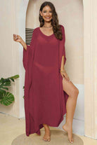 - This V-Neck Three-Quarter Sleeve Cover-Up is a beach-style solid with basic features. It's made from 100% polyester with no stretch, and hand washing cold is recommended. The sleeve length is three-quarter, and the sheerness is sheer. Measurements:
