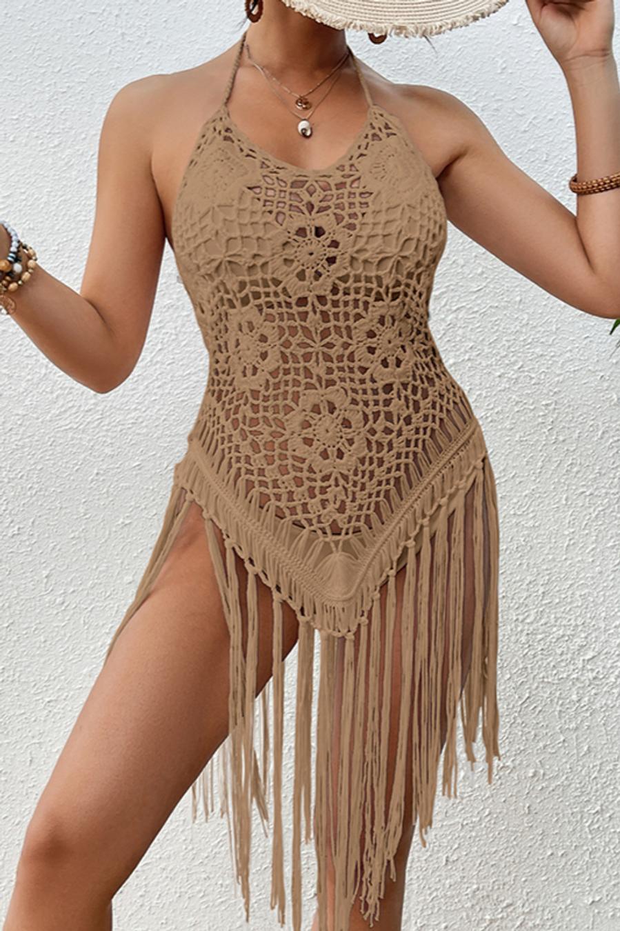 Stay stylish and cool this summer with our Halter Style Crochet Coverup! With its unique cut outs and tassel details, you'll stand out on the beach or by the pool. Available in 5 beautiful colors, this coverup is a must-have for any fashion-forward individual.