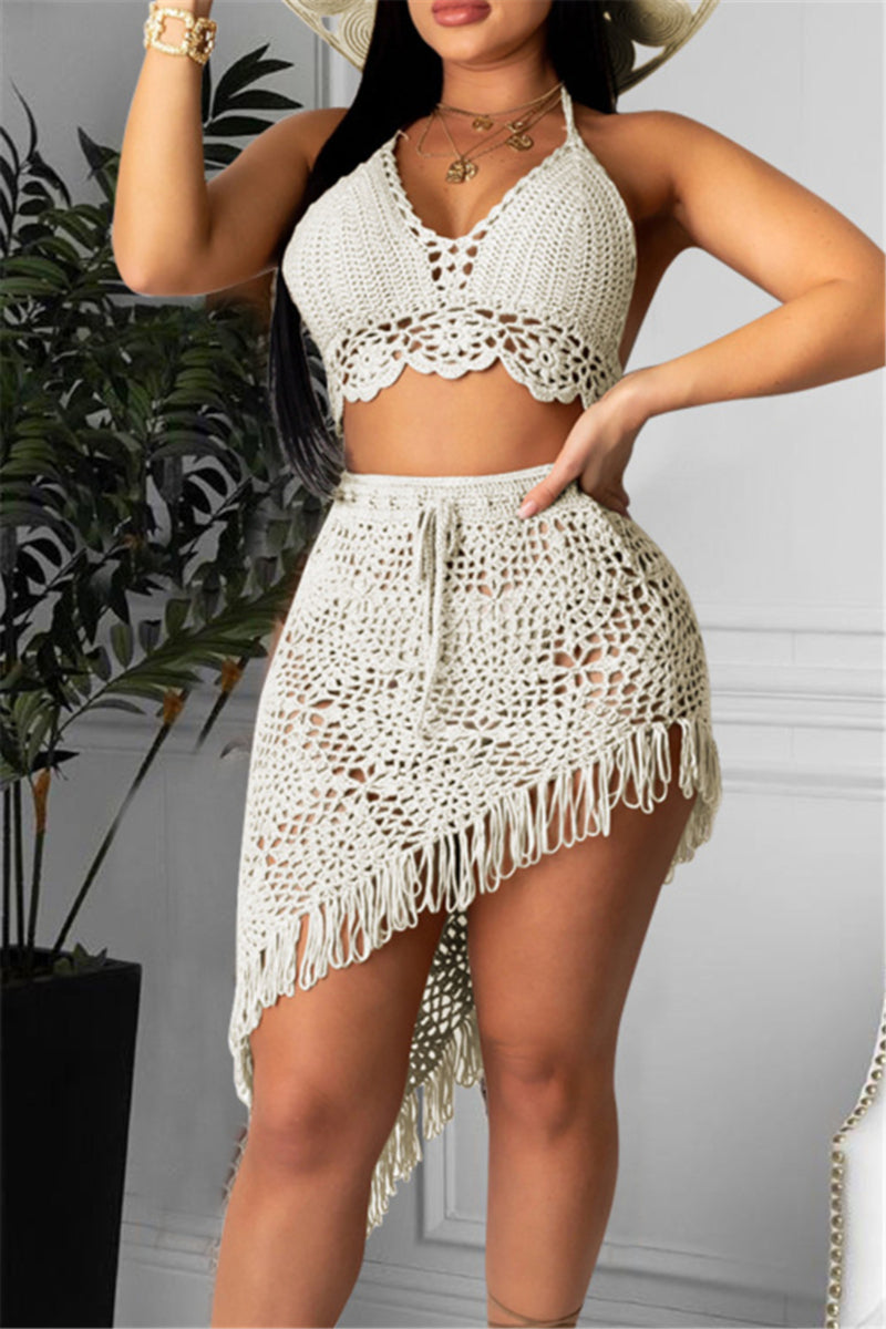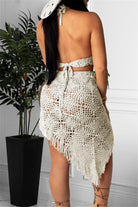 This elegant 2-piece halter top and sarong cover-up set is crafted with delicate white crochet material, perfect for your next pool or beach party. The halter style adds a touch of sophistication, while the see-through sarong cover-up provides a flowy and flattering look. Stay stylish and comfortable under the sun with this must-have set.