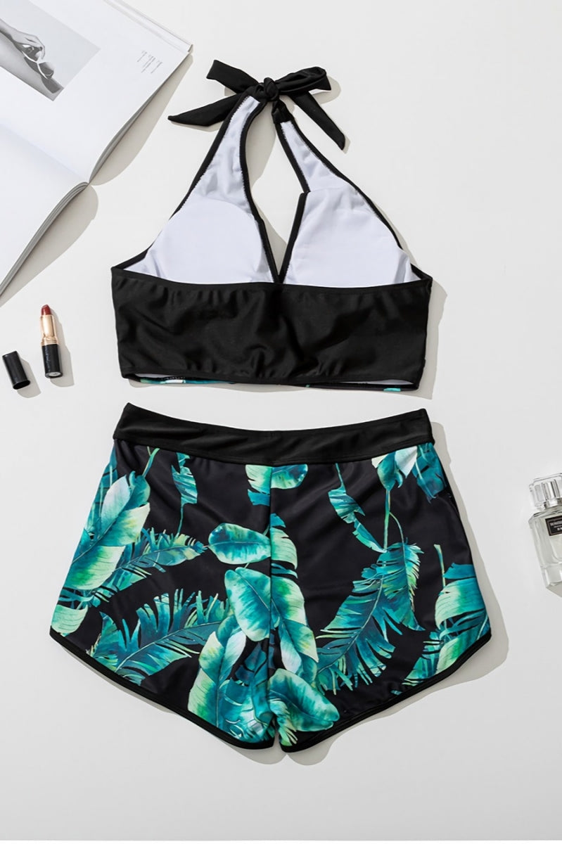 Leaf Print Halter Style Bikini with Sassy Short Bottom Plus Sizes Available (L-4XL)