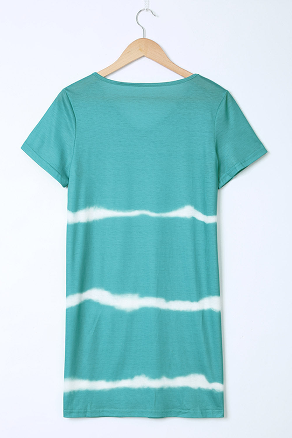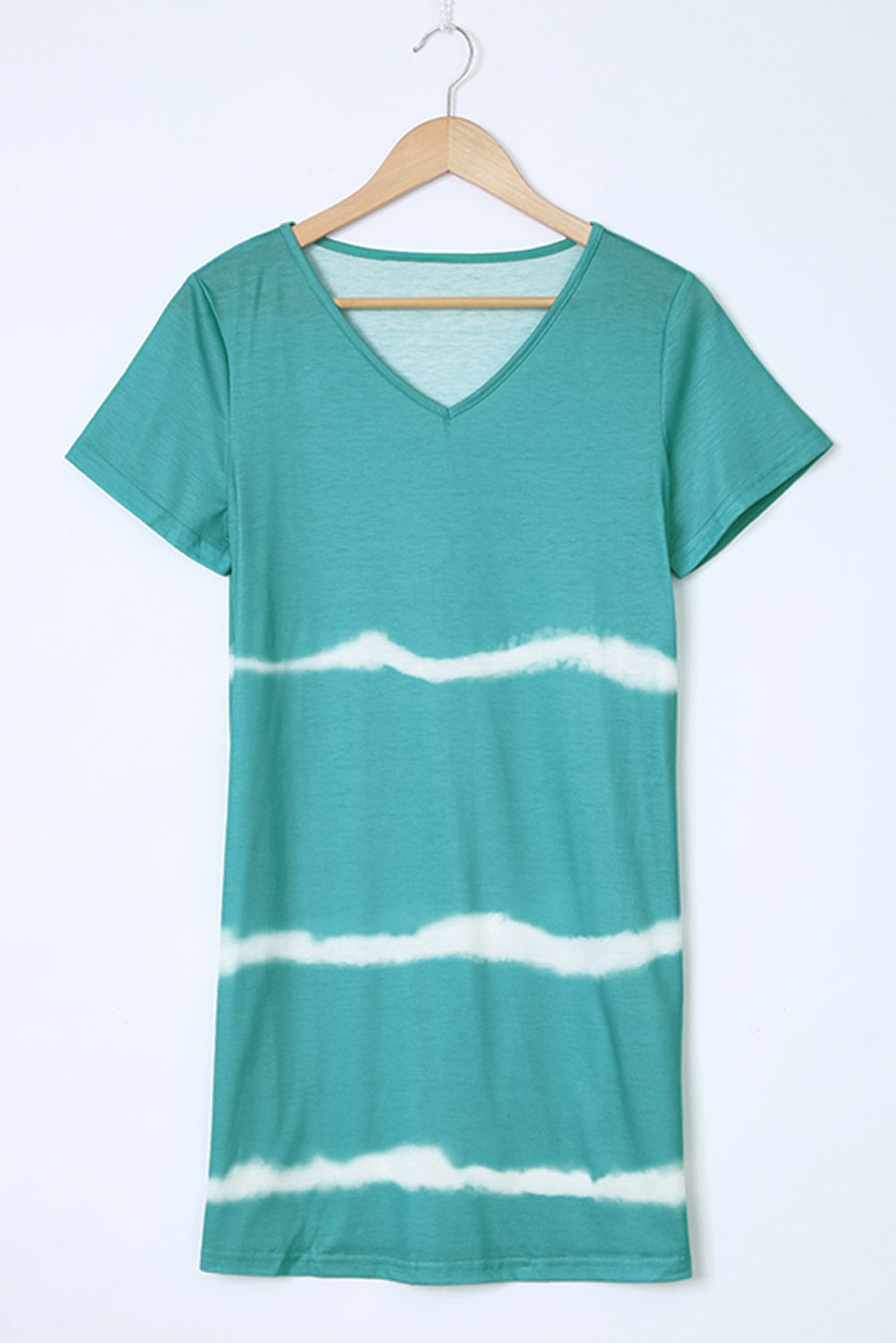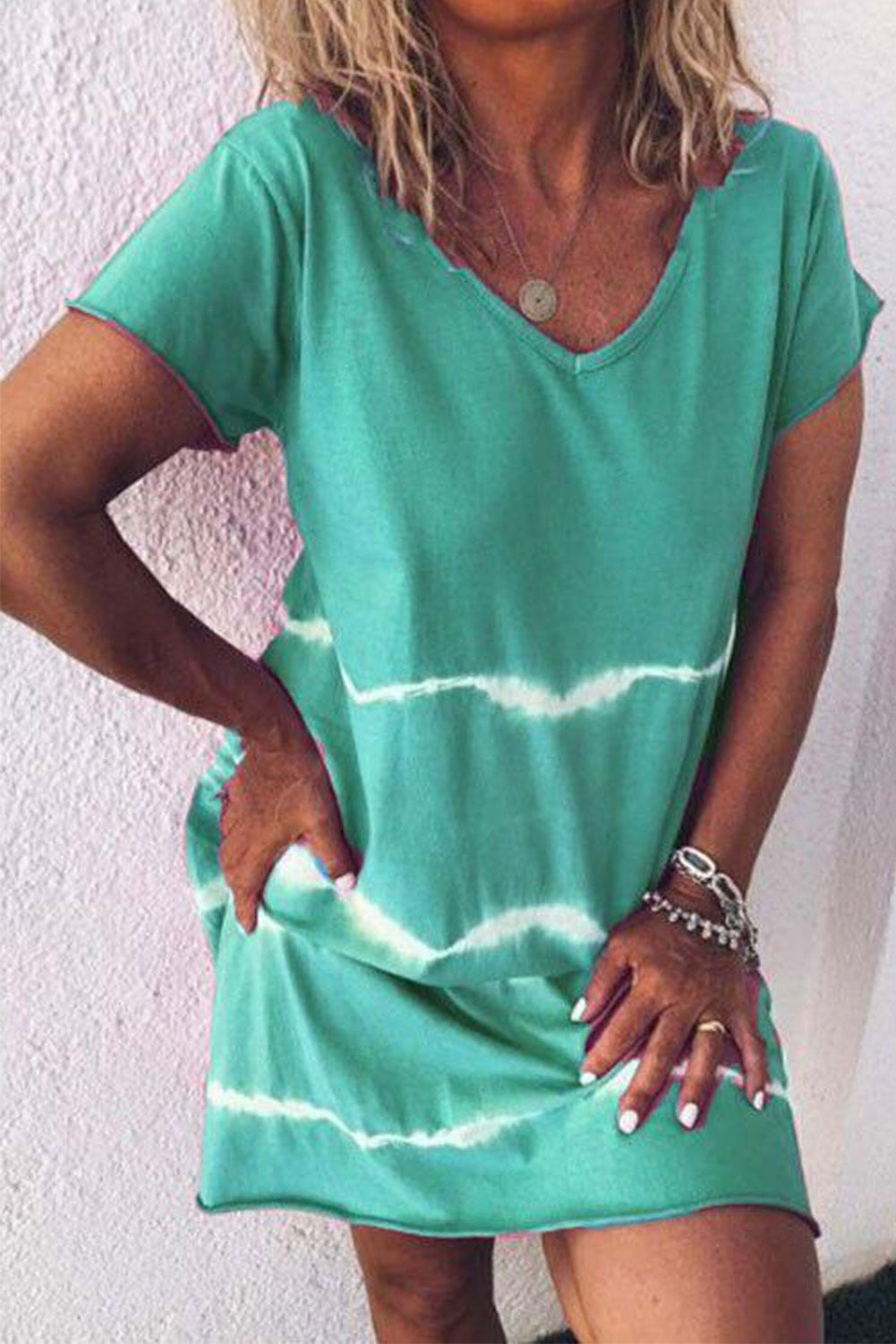 his casual mini dress is composed of top-notch material, designed for both breathability and comfort. With a V-neck and short sleeves, the dress has a modern silhouette with a straight hemline. Its tie-dye stripe pattern is fashionable and popular.