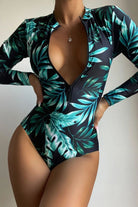 Leaf Print Zip-up Rash Guard One Piece Swimsuit