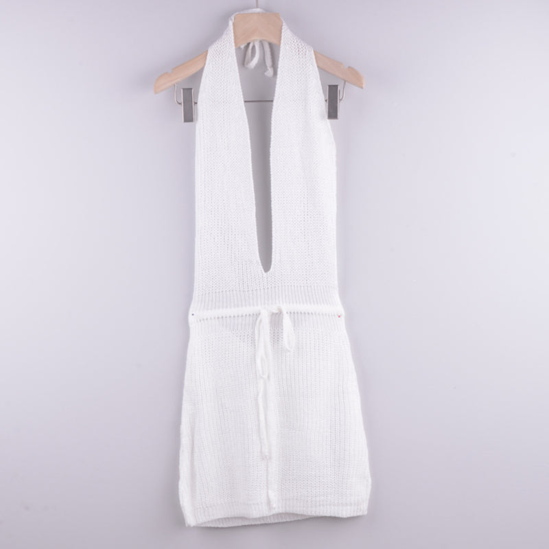 This knitted deep V beach cover-up is lightweight and breathable, featuring an open back. It's an ideal accompaniment to a warm-weather day at the beach or pool, and its sheer fabric lends itself to pairing with a stylish bikini or one-piece swimsuit.